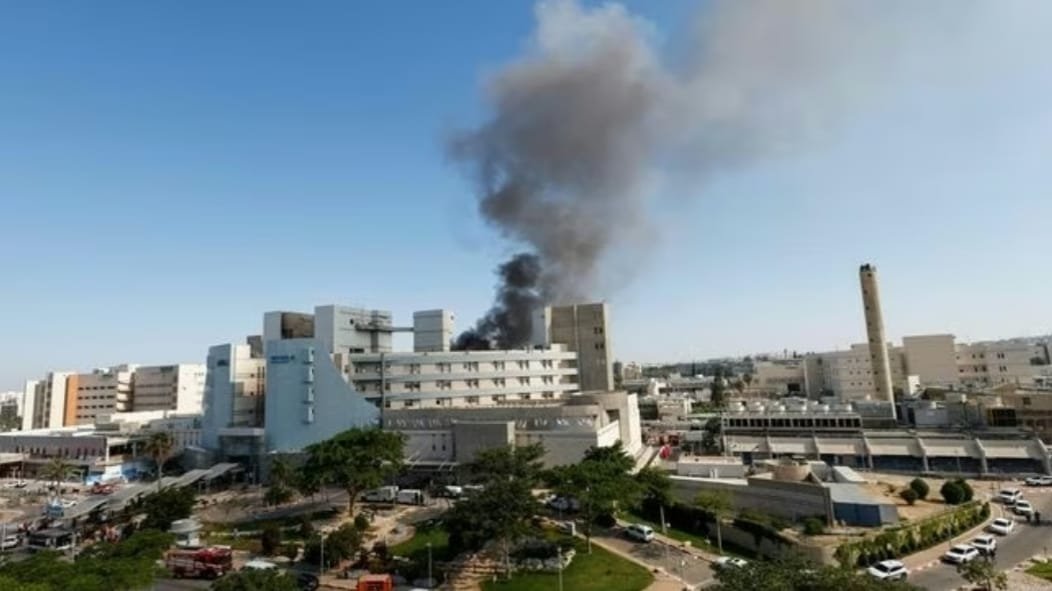 Asap membumbung dari Soroka Medical Center di Be'er Sheva, Israel selatan, usai dihantam rudal Iran pada Rabu (19/6/2025) dini hari. Serangan ini menyebabkan puluhan orang terluka dan menuai kecaman dari pemerintah Israel. Sumber Foto: REUTERS/Amir Cohen