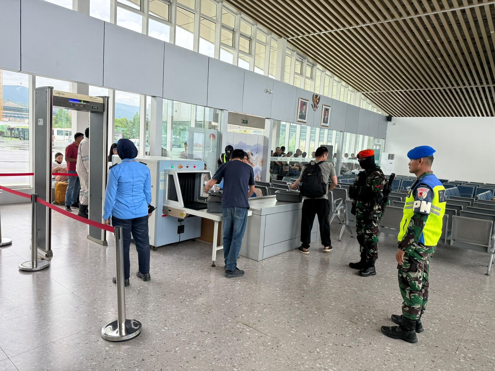 "Personel TNI AU bersama Avsec Bandara Khusus Weda Bay melakukan pemeriksaan keamanan penumpang dan bagasi melalui X-Ray sebagai bagian dari upaya menjaga keselamatan penerbangan."